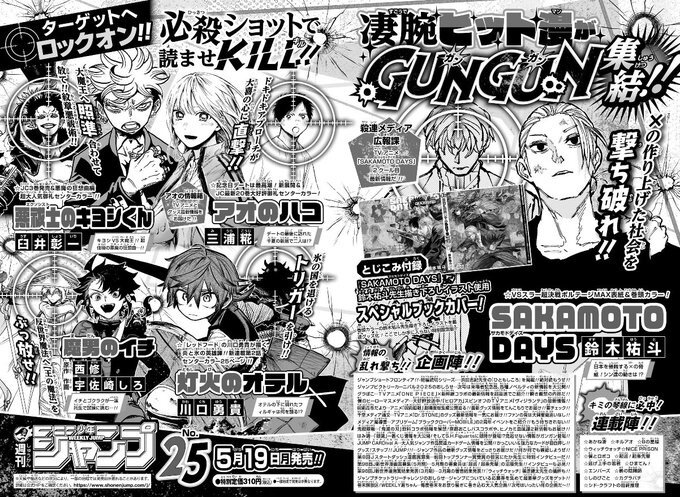 Cover and frontispiece: The Ottel of the Firelight Brochure: The Male Demon Ichiki, The Yin-Yang Master of the Crow (2nd Anniversary), The Patience of the Hidden Preview of Issue 25 Cover and frontispiece: (Sakamoto's Days) Brochure: The Ottel of the Firelight, The Blue Box, On break: One Piece